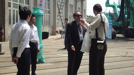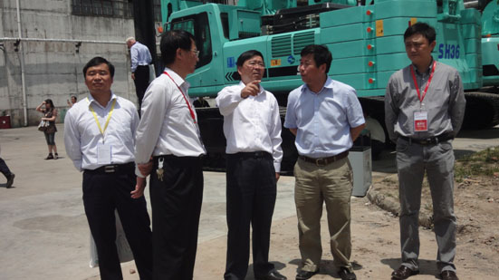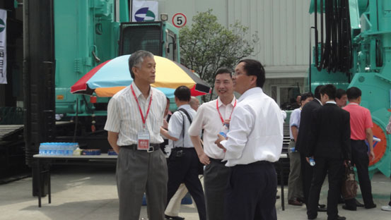 正在和用户代表攀谈的中国工程机械工业协会会长祁俊与书记马卫东
