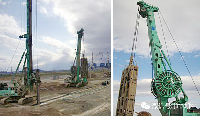 位于哈密伊吾县淖毛湖镇境内的新疆广汇能源有限公司120万吨甲醛/80万吨二甲醚项目占地面积为100公顷,总投资额近70亿元,是新疆“十二五”期间重点投资项目。该项目配套设施之一的地下水污染防治工程防渗处理采用的是地下连续墙施工工艺。资料显示,防渗墙墙体总长超过3200米,成槽开挖土方近14万立方米,地连墙槽宽0.8米,槽深19.5-34.5米不等,地层以砂层、卵石层和砂岩层为主。由于地质结构较为复杂,岩层、卵石分布不均,在硬岩地层单以抓斗取土成槽无法满足施工进度。为此,施工方采用SD/SH旋挖钻进引孔,随后在一般地层以SG抓斗取土直接成槽、如遇较硬砂岩则以DX800单论铣槽机对岩层进行铣削、气举排渣成槽的组合工法施工。